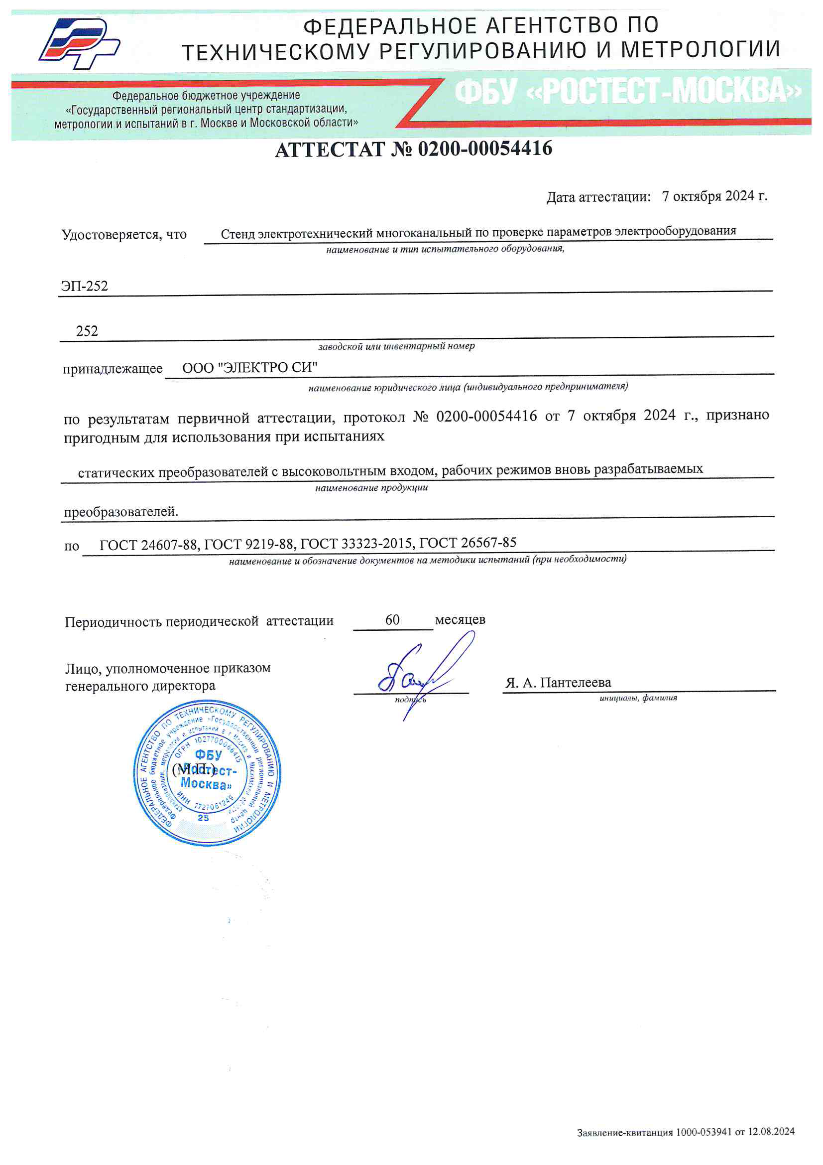 Напряжение: 0…400±20В; ток: до 250 А; частота: 50 Гц |