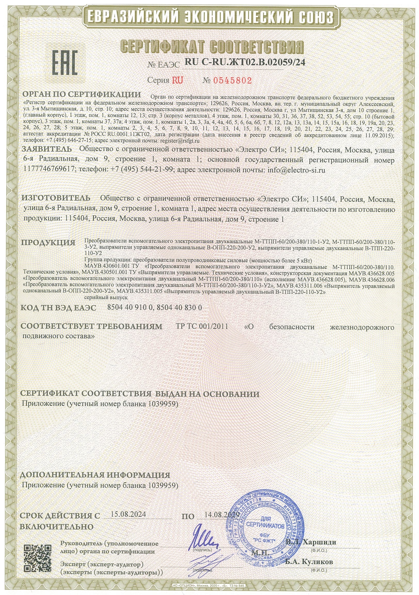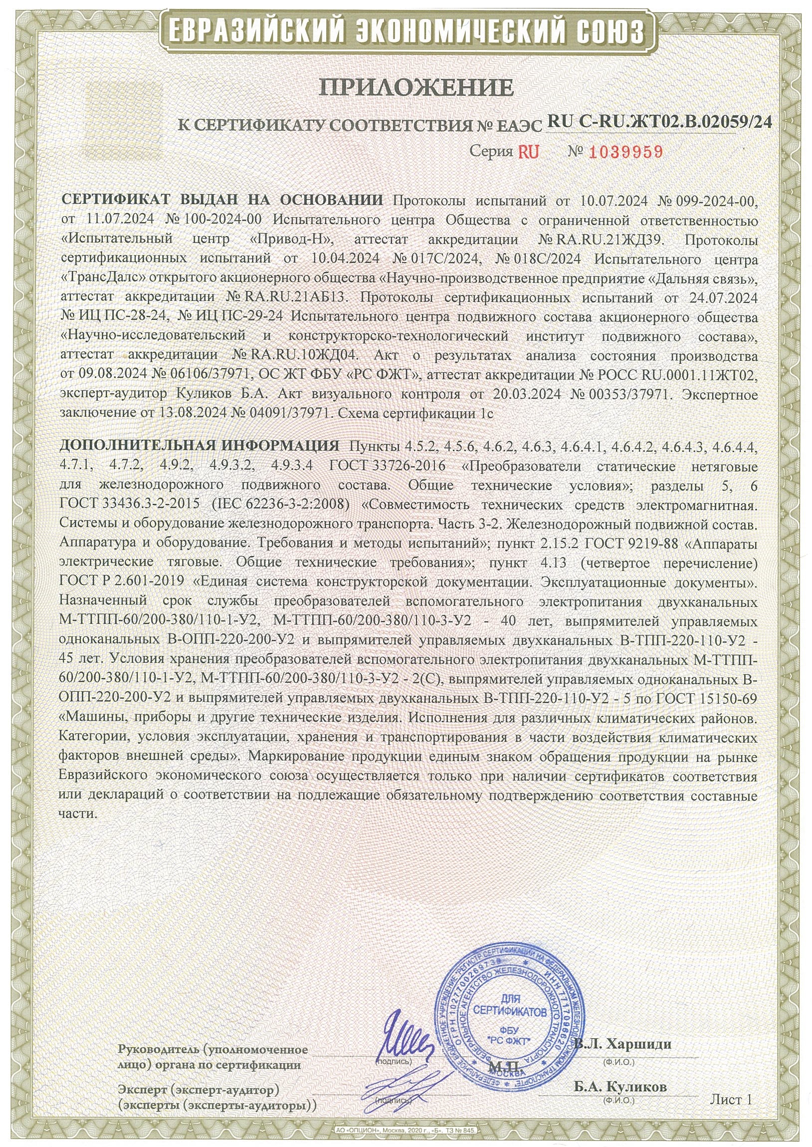 Сертификат соответствия преобразователя вспомогательного электропитания двухканального М-ТТПП-60/220-380/110 таможенного союза: